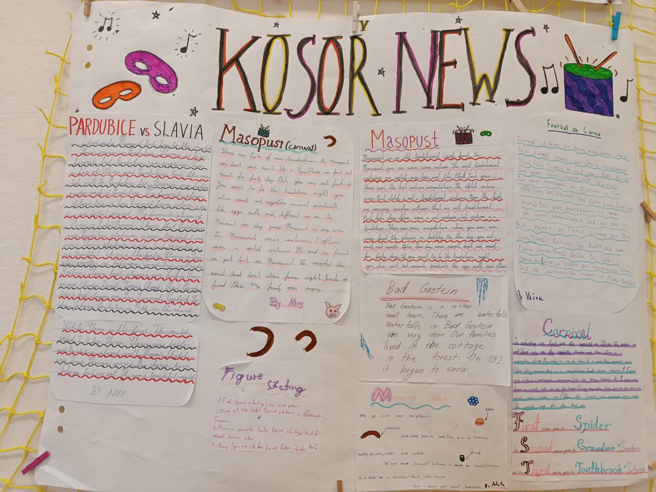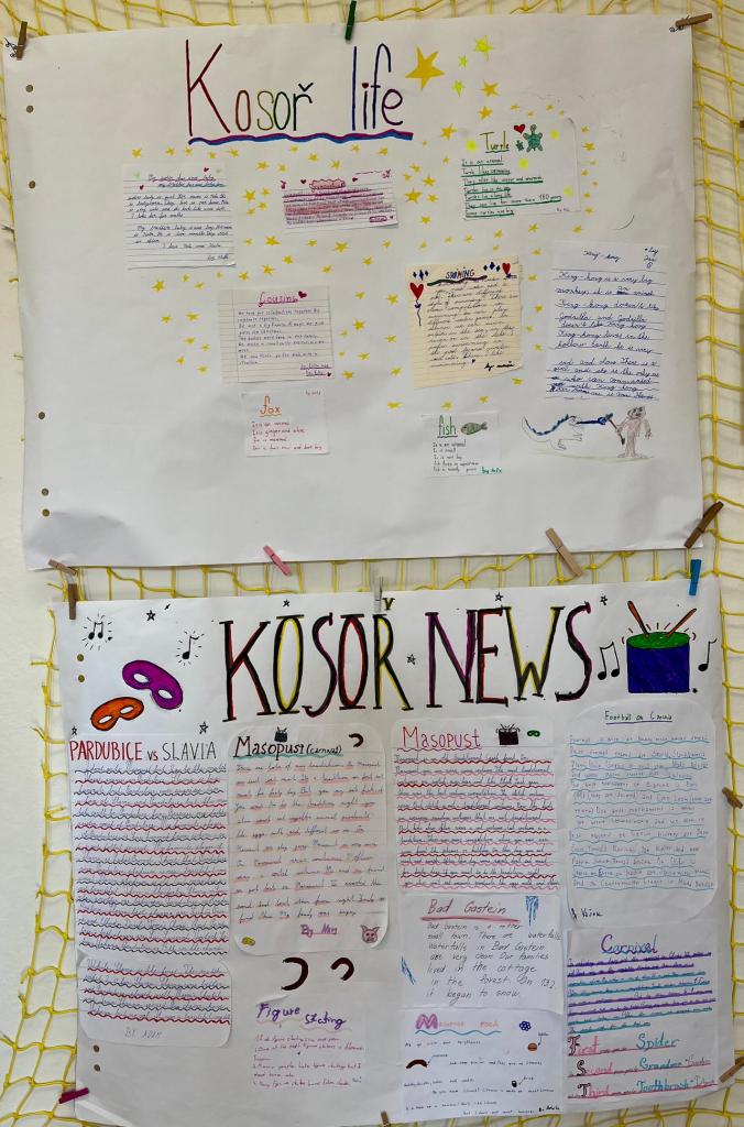 V hodinách angličtiny se stáváme i novináři. Máme dvě konkurenční redakce a pravidelně vydáváme dva konkurenční časopisy. KOSOŘ LIFE a KOSOŘ NEWS. Píšeme o aktuálních tématech, o koníčcích, sportu, zvířatech.....