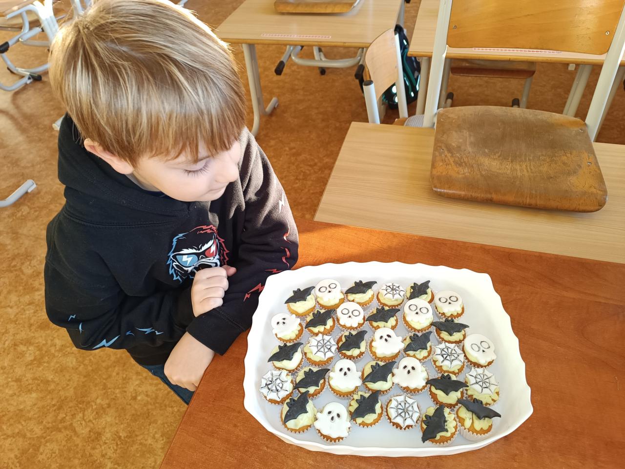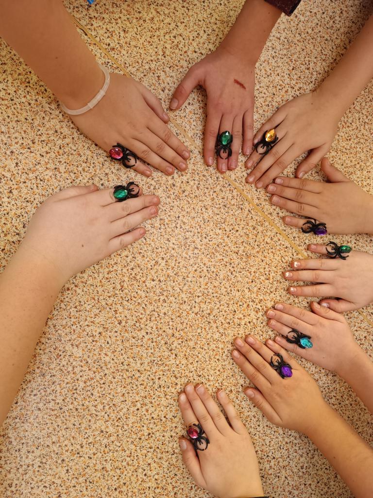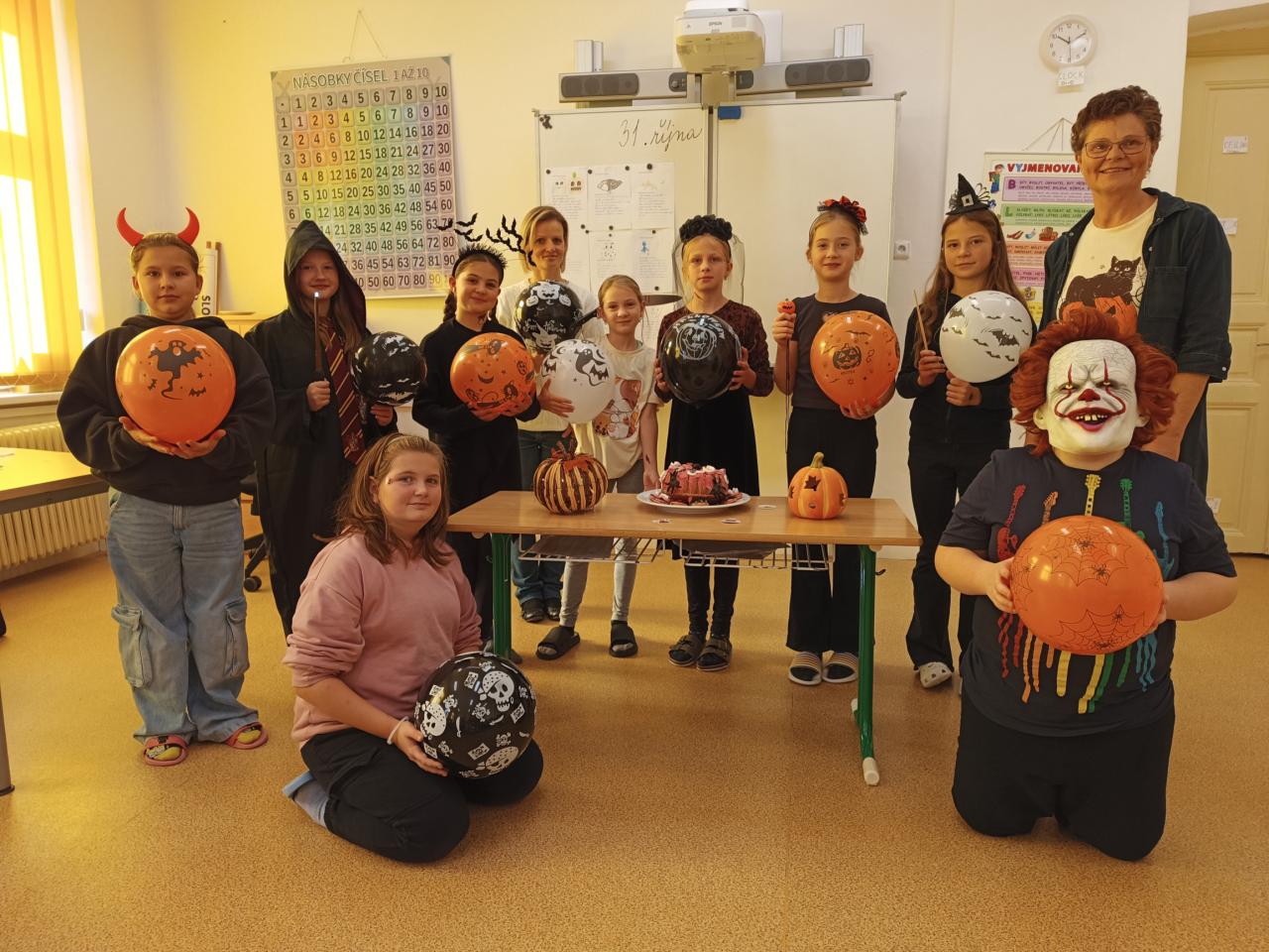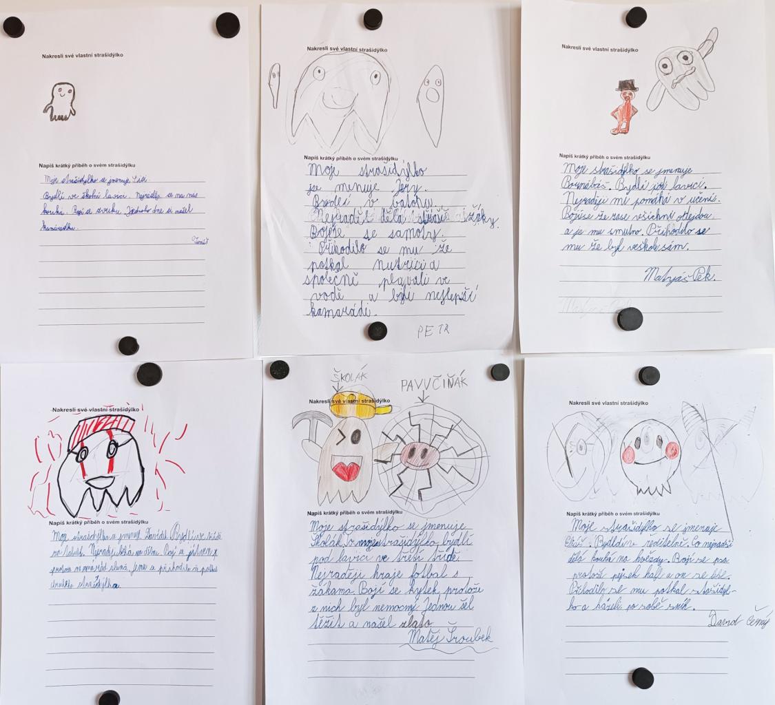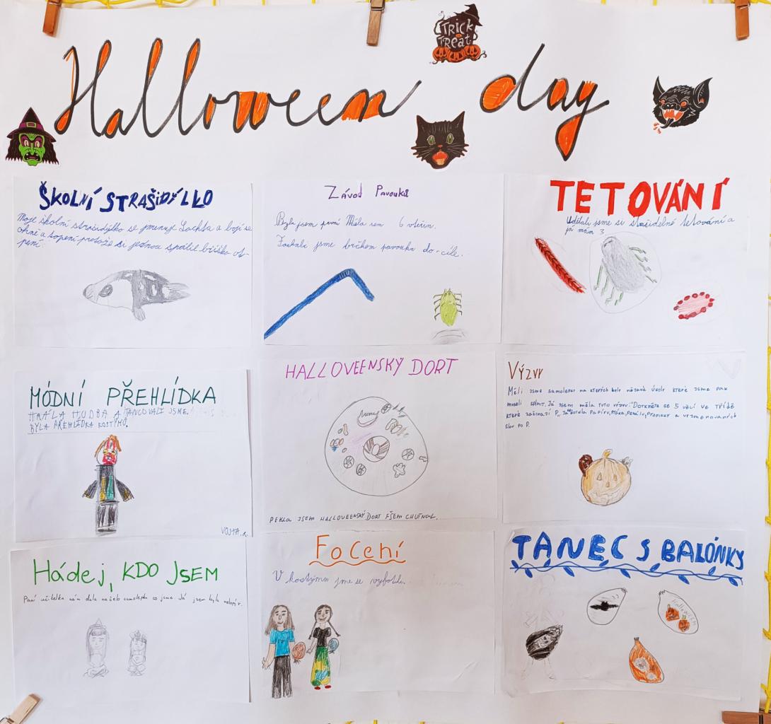 Dnešní den jsme si náramně užili! Vytvořili jsme školní strašidélka a ozdobili se tetováními. Zatančili jsme si s balónky, zúčastnili se přehlídky masek. Hráli jsme hru 'Hádej, kdo jsem', uspořádali závody pavouků a plnili halloweenské výzvy. Šmákli jsme si na moc chutném strašidelném dortíku.
