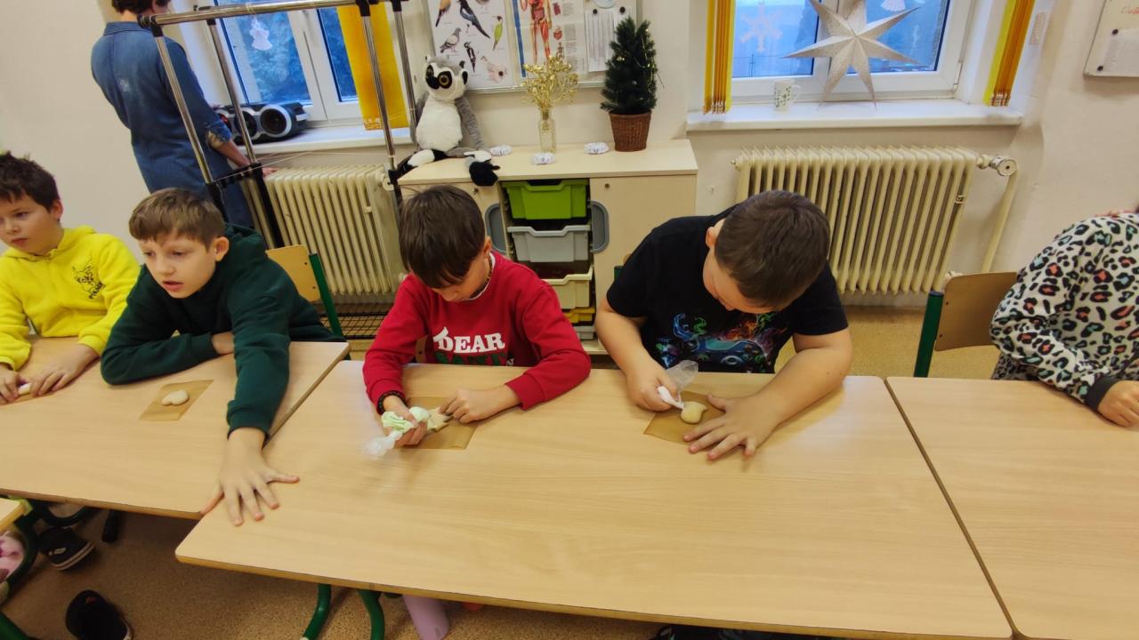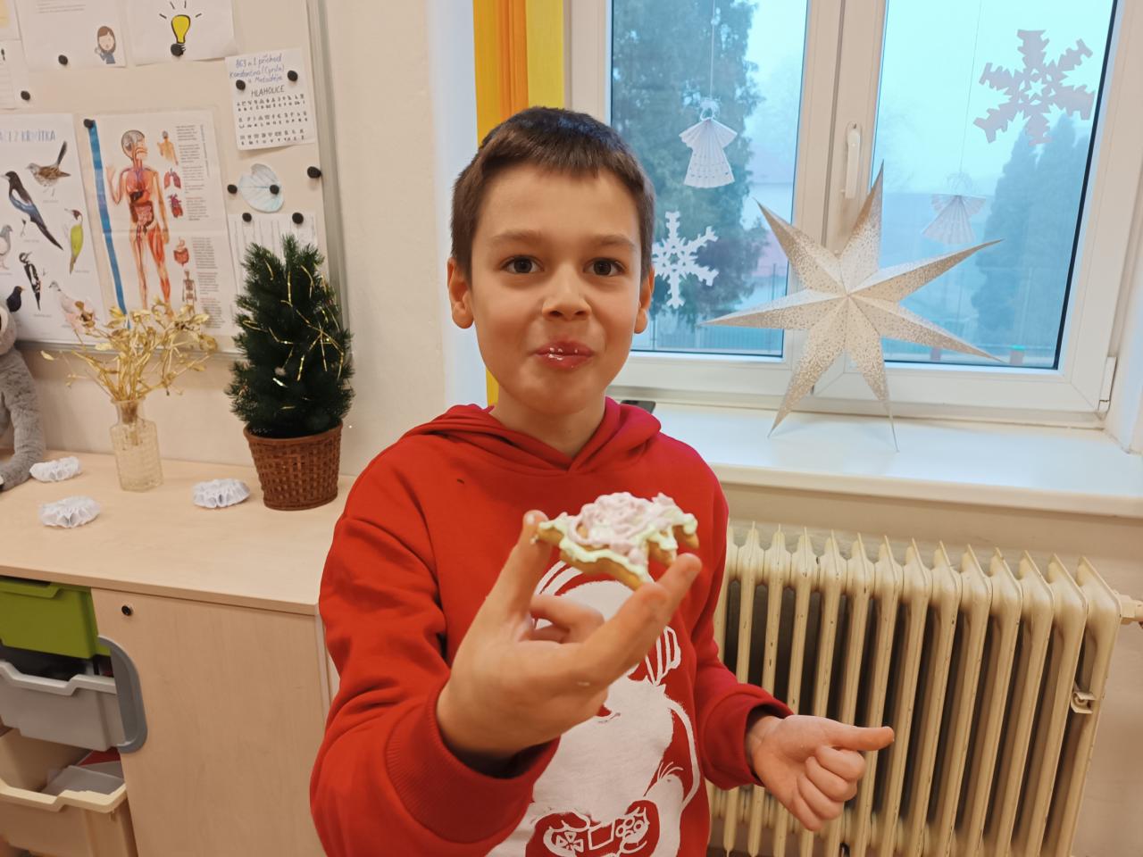 Čtvrtek 18.prosince byl ve znamení adventní pyžamové výzvy a zdobení perníčků. Zkusili jsme si zadělat těsto podle receptu. Perníčky jsme bohatě nazdobili a snědli. Byly Mňam. S psycholožkou Zuzkou jsme společně skládali vánoční stromek.